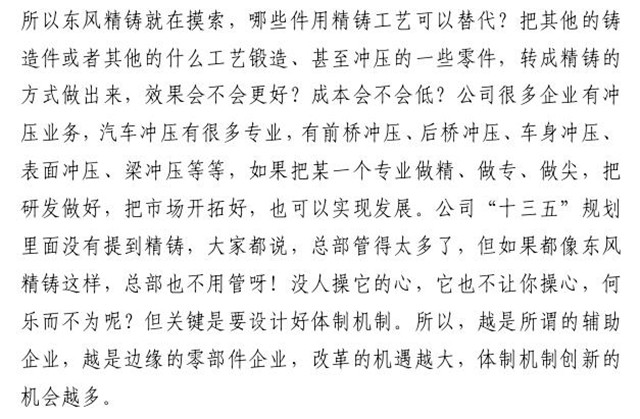 在2016年7月23日東風汽車公司2016年年中工作會上,東風汽車公司董事長、黨委書記竺延風同志對東風精鑄改革與經營管理等方面的做法給予了充分肯定,要求東風公司相關單位予以借鑒,并深入推進各單位改革與創新工作。