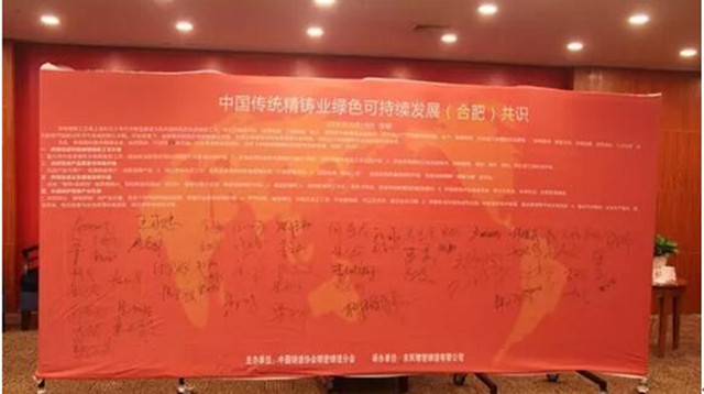 在東風精鑄、精鑄分會組織倡議下,10月28日,傳統精鑄第五屆高層論壇順利舉行,來自國內重點精鑄企業、科研院所、社團等 95名代表,在安徽合肥共同見識了《中國傳統精鑄業綠色可持續發展合肥共識》簽字儀式,其中60余名代表在幕板上簽字表達了綠色可持續發展的決心。
